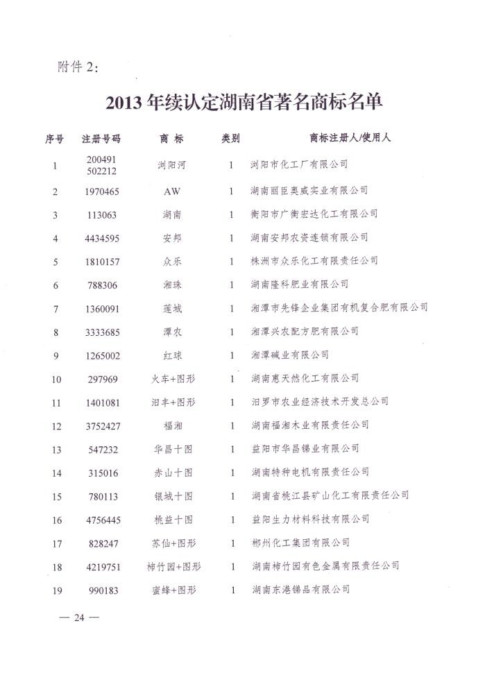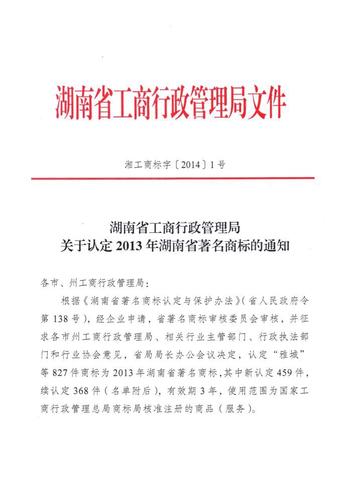 2014.02.19 根据《湖南省著名商标认定与保护办法》(湖南省人民政府令第138号),经湖南省著名商标审核委员会审核,并征求各市州工商行政管理局、相关行业主管部门、行政执法部门和行业协会意见,湖南省工商行政管理局局长办公会议决定,续认定“龙行天下+图形”商标为2013年湖南省著名商标,有效期3年。“龙行天下+图形”商标已于2004年、2007年、2010年、2013年连续四次被认定为湖南省著名商标。
